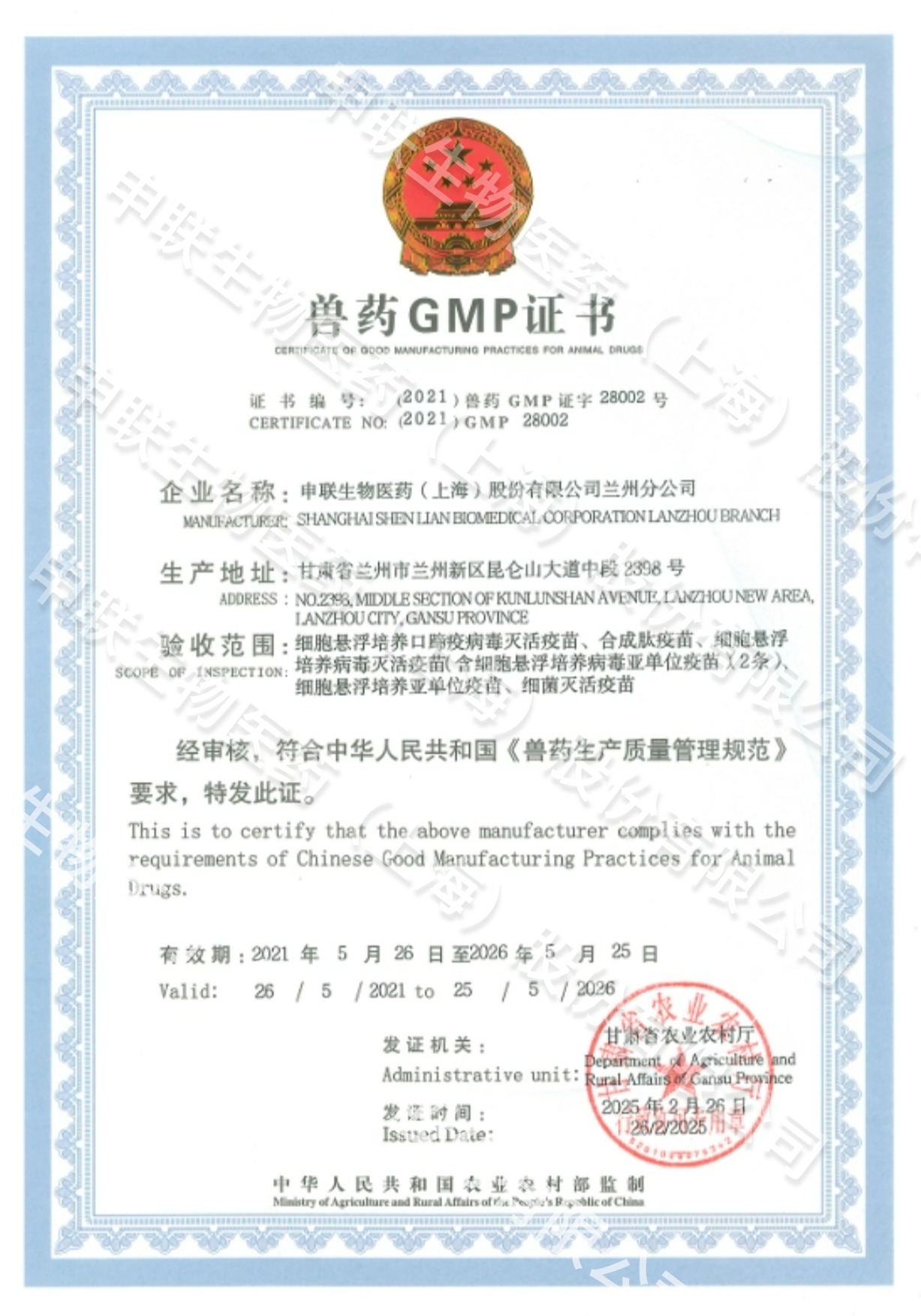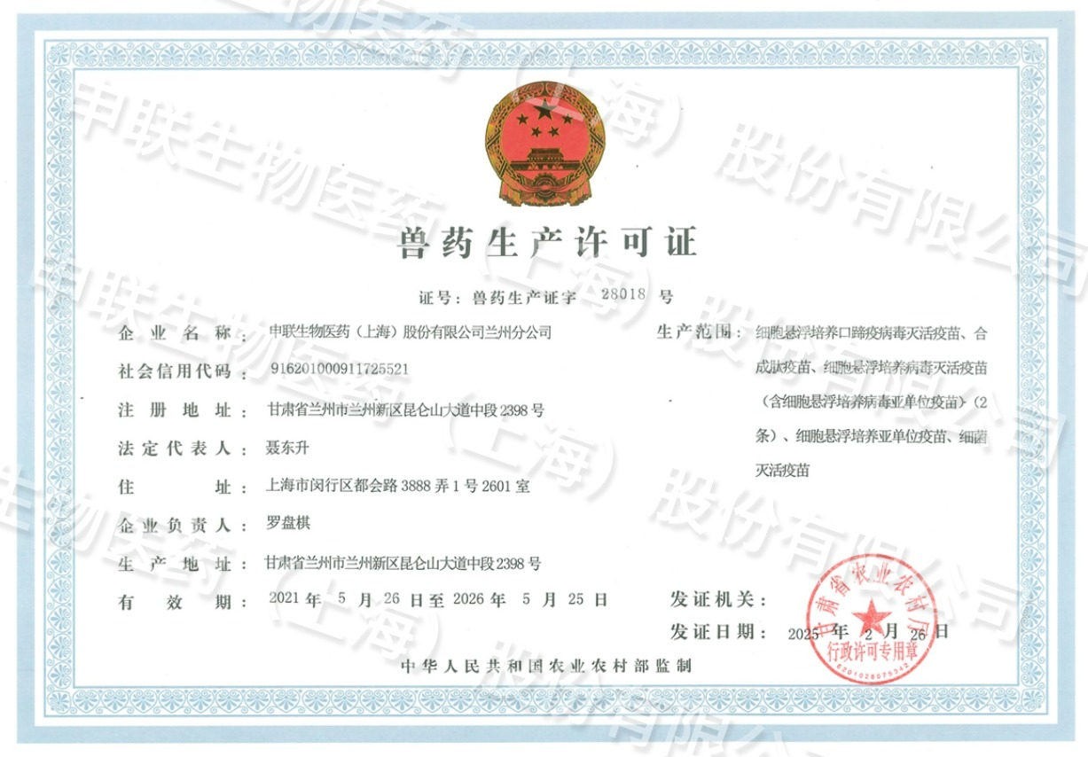 2025年2月26日,yth2206游艇会生物医药(上海)股份有限公司兰州分公司取得甘肃省农业农村厅新核发的《兽药GMP证书》和《兽药生产许可证》。