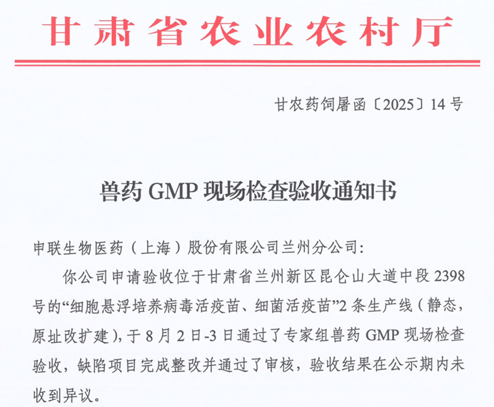 近日,yth2206游艇会生物兰州分公司“细胞悬浮培养病毒活疫苗、细菌活疫苗”2条生产线(静态,原址改扩建)已顺利通过兽药GMP静态验收。本次验收由甘肃省农业农村厅组织,中国兽医药品监察所会同甘肃省农产品质量安全检验检测中心,依据《兽药生产质量管理规范》(2020年修订版)相关标准共同完成。