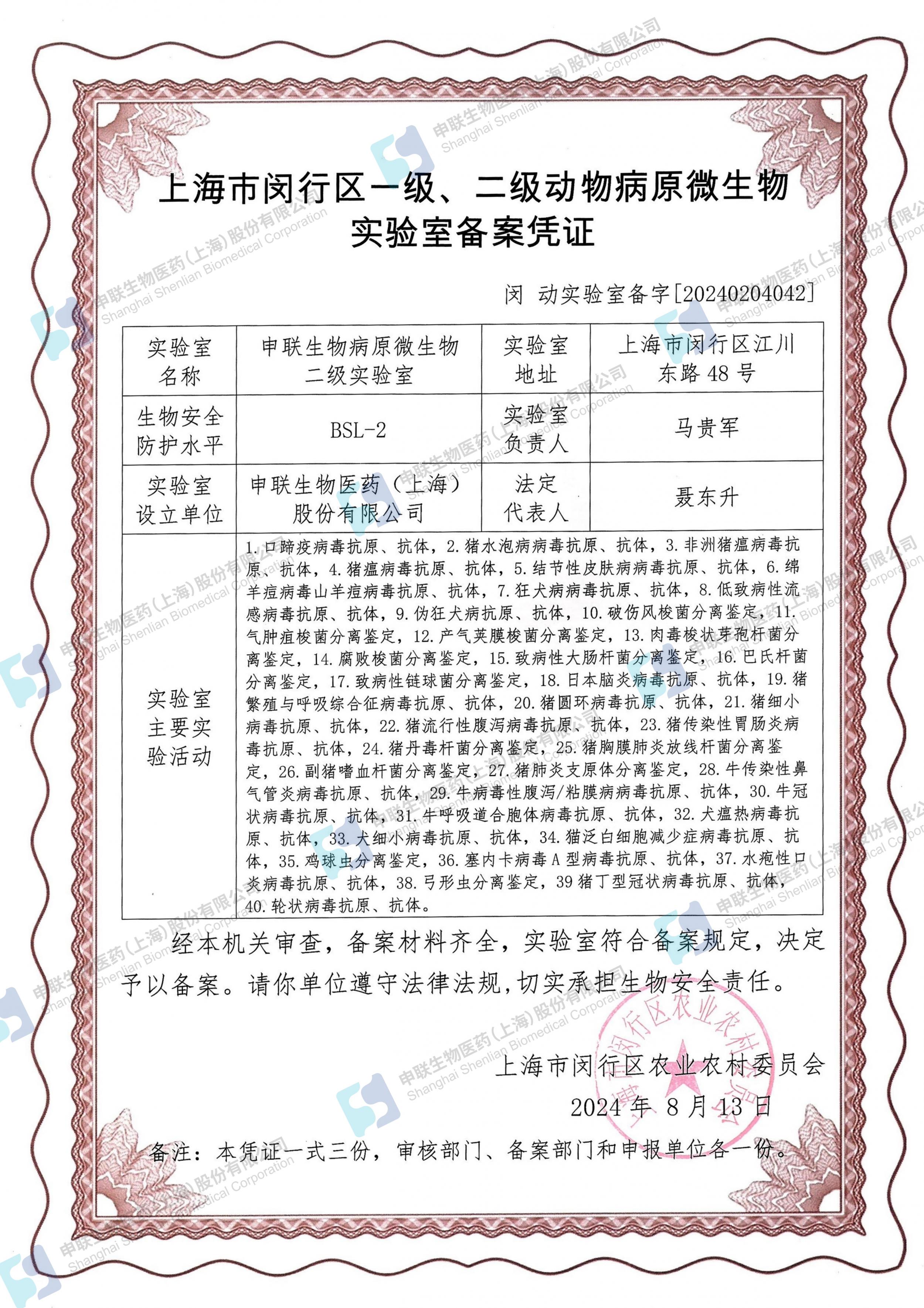 经专家组综合评定,yth2206游艇会生物病原微生物实验室通过了现场检查,并于2024年8月13日取得了动物病原微生物生物安全二级 (BSL- 2)实验室备案证书。